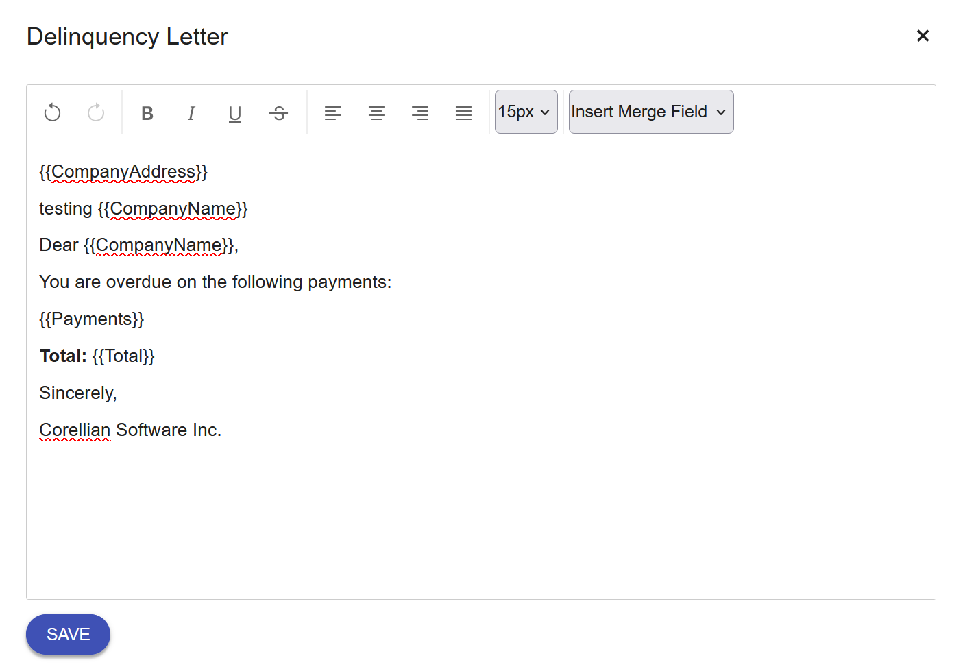 Templates generally don't need to be updated very often. One delinquency letter template may be created for your organization.